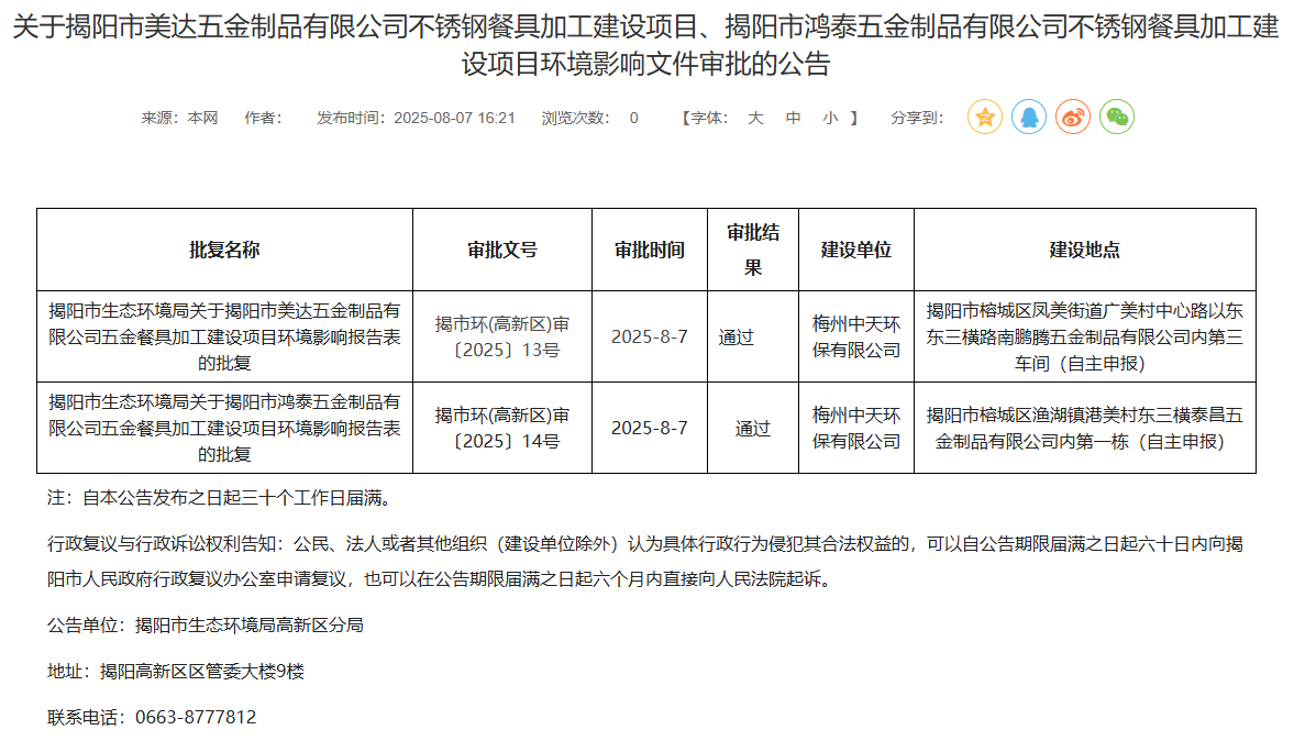 2025年8月7日,揭阳市生态环境局高新区分局就2个不锈钢餐具加工建设项目环境影响报告表作出审批通过并对外进行公告,公告期:自本公告发布之日起三十个工作日届满。