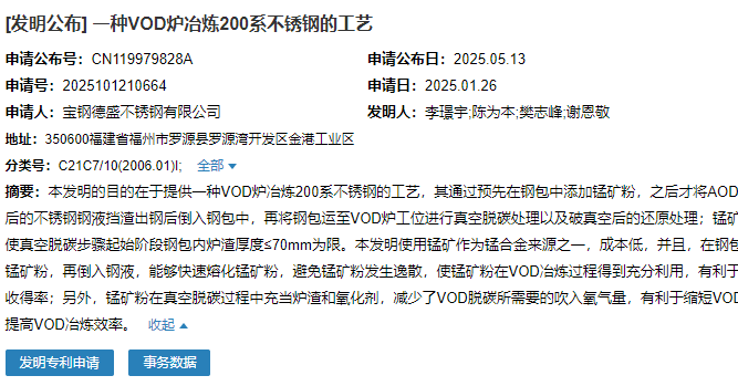 2025年5月13日,宝钢德盛不锈钢有限公司成功申请一项名为“一种vod炉冶炼200系不锈钢的工艺”专利,申请公布号为cn119979828a,申请日期为2025年1月26日。